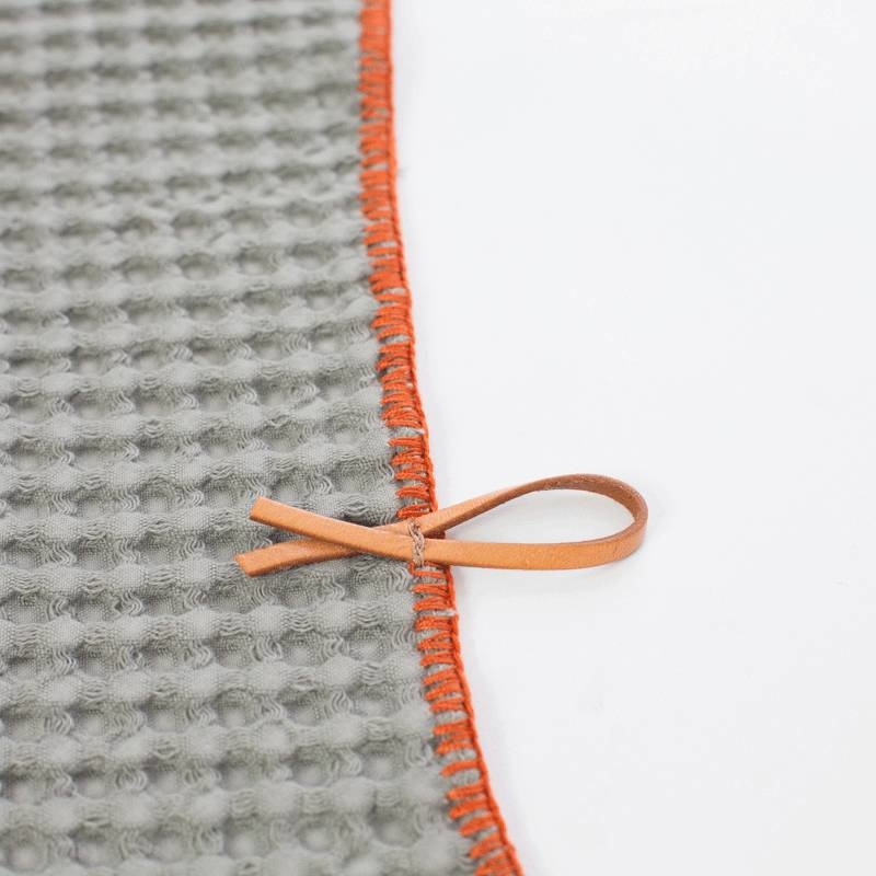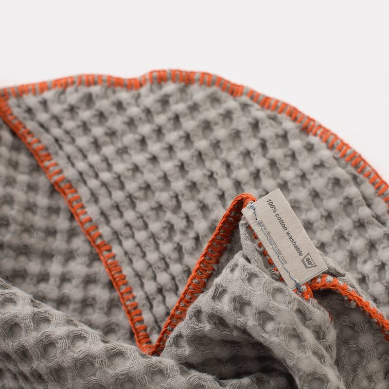 De handdoeken zijn grijs van kleur. De handdoeken zijn verkrijgbaar in twee formaten: 65 x 90 cm en 100 x 120 cm.