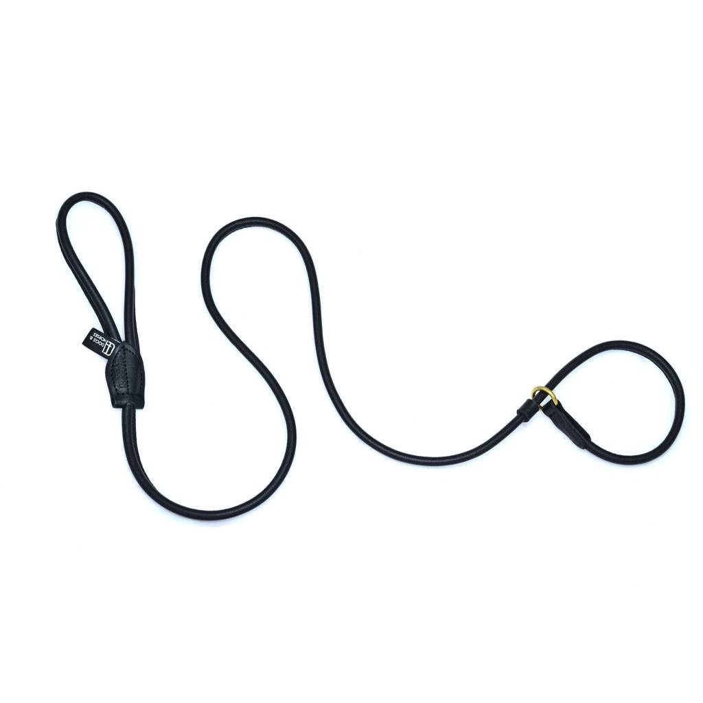 Deze lederen hondenriem is eigenlijk een halsband en hondenriem in één. Met deze slip lead kun je je hond trainen om netjes naast je te lopen. De riem is 150 cm lang en geschikt voor middelgrote honden zoals een labrador. Bij een kleinere hond is de lijn wat langer. De riem is handgemaakt in Engeland en is 10 mm dik. Een sterke lijn voor veel wandelplezier met je beste vriend. De stoere riem is zwart van kleur.